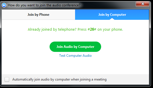 You will need to determine how you would like to connect to the call, using your computer with audio and video, connecting using your computer's video and your phone for audio, or connecting by phone using audio only.