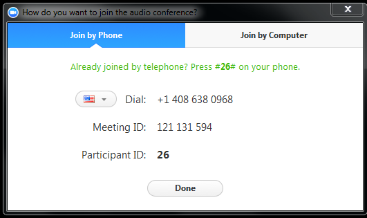 If you would like to join the audio by phone, click on the Join by Phone tab. There you will find the number to call. If you need an international number, use the flag dropdown to get a number in your country of choice. After dialing into the call, you will be prompted for the Meeting ID and Participant ID.